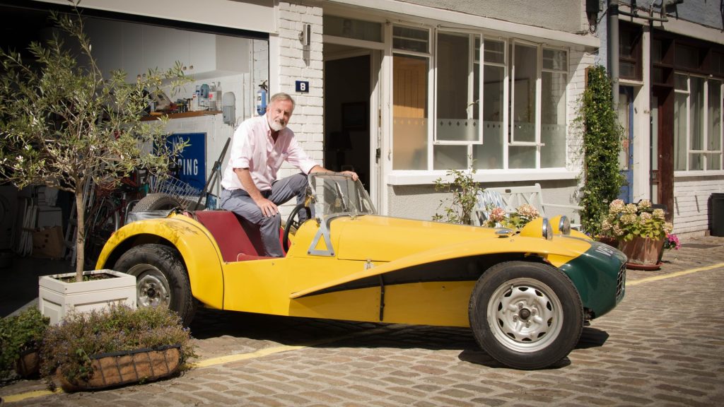 Fear not. George hasn’t given up everything four wheeled and continues the fight for The Bohemian Lifestyle. He’s kept his beloved Cosworth Lotus 7 Mk2. George purchased this in 1967 after watching Patrick McGoohan in the cult TV Series The Prisoner. It took only moments to wheel the yellow Cosworth out of his tiny garage. I worried that we would scratch the paintwork, forgetting that George has rolled cars out of tiny garage spaces by the tens & tens of thousands since 1976. Good to know he’s still got it.